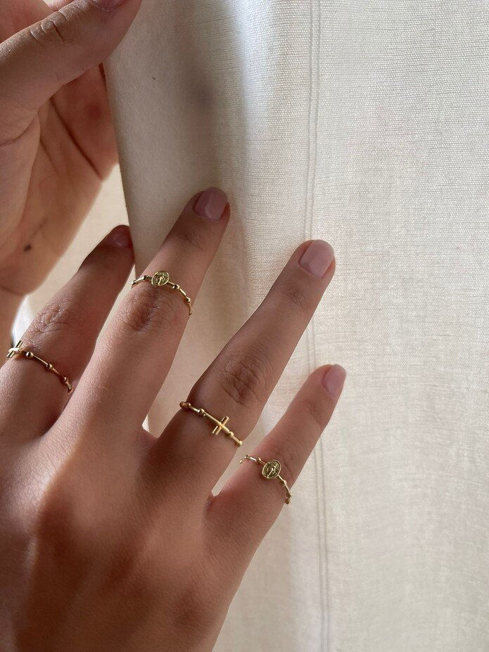 L’anello Rosario in oro 18K presenta al centro la Medaglia della Madonna Miracolosa, anche conosciuta come la Medaglia della Immacolata Concezione, ispirata alle indicazioni che la Vergine Maria avrebbe dato a Santa Caterina Labouré, una suora delle Figlie della Carità di San Vincenzo de’ Paoli, durante una visione avvenuta nel 1830 a Parigi, in Rue du Bac.
