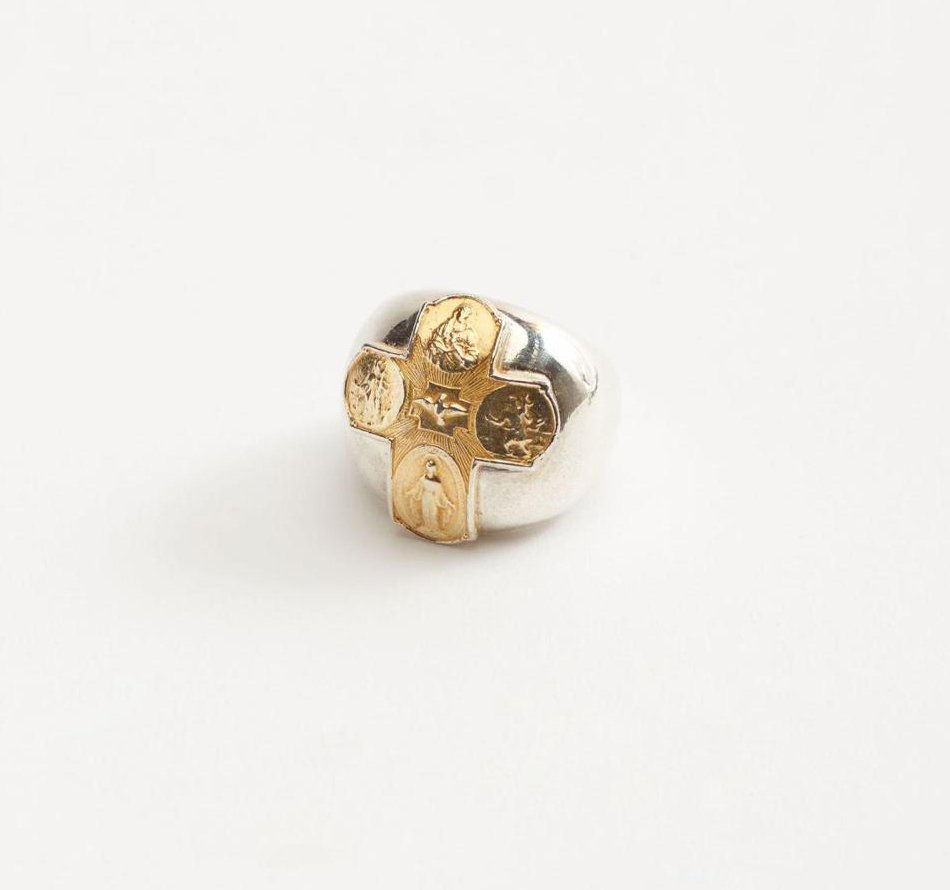 Croce scapolare in oro; all’interno di questa croce: Sacro Cuore di Gesù, Madonna del Carmelo, Medaglia Miracolosa, San Cristoforo, Colomba Spirito Santo. Lo scapolare protezione dal male, San Cristoforo protettore dei viaggiatori, Medaglia Miracolosa e Spirito Santo simbolo di grazia.