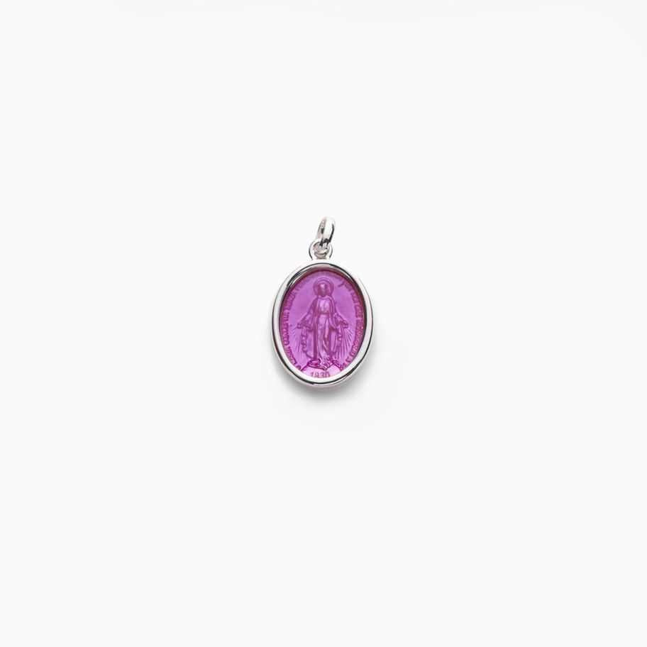 Ciondolo Classico della Madonna Miracolosa con castone, disponibile in diversi colori e perfetto da utilizzare su una catenina o su un bracciale.