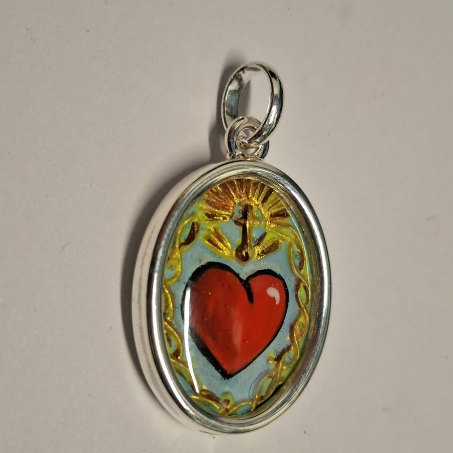 Ciondolo del Cuore Sacro Ex-Voto con castone, dipinto a mano in argento 925.